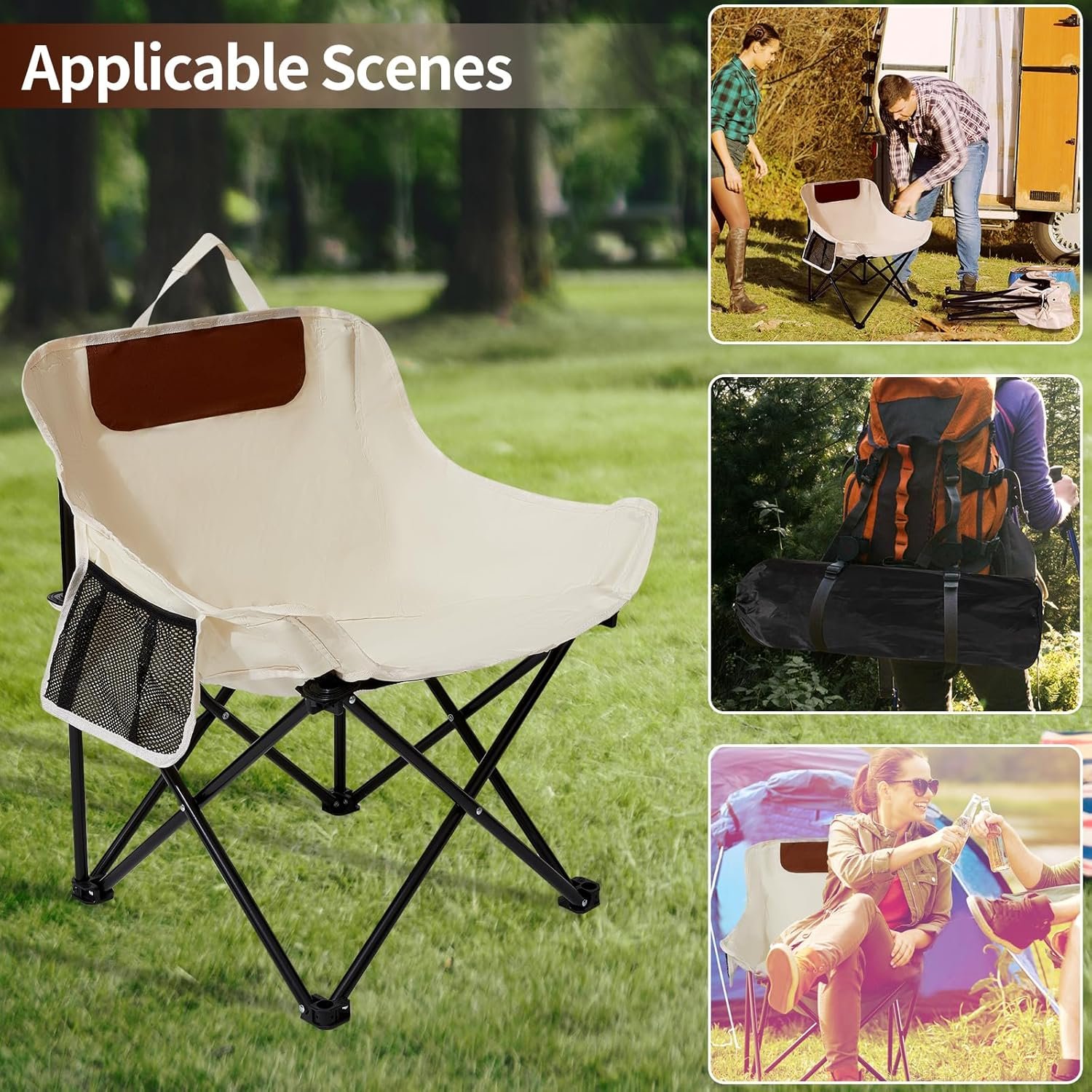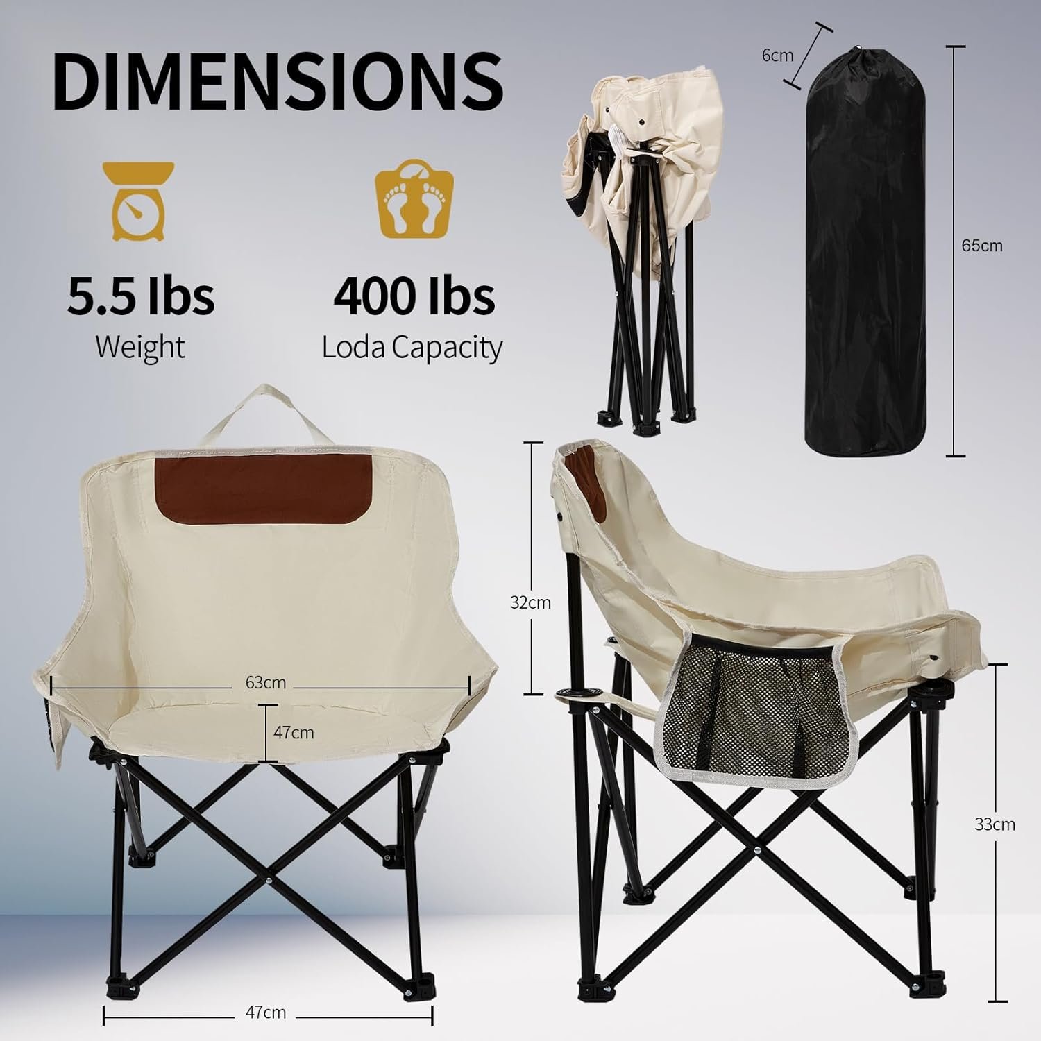 • 🌞 Durable and Reliable:This folding camping chair weighs about 5.5 pounds. It adopts a triangular reinforcement and stability design, allowing it to withstand a maximum ergonomic load capacity of 400 pounds. It is designed with rust-resistant light aluminum alloy as the frame and 600D Oxford cloth fabric as the cover tear-resistant, breathable and fade-resistant and stable.