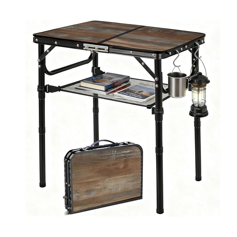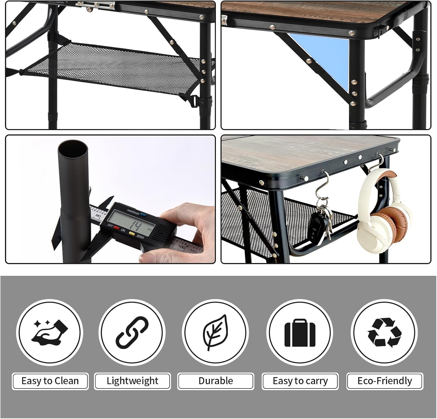 - Extra storage:Our fold table features mesh storage and S hooks for holding kitchen tools, snacks, books,utensils, games, phones, magazines,reading materials, flashlights, hang speakers, bags, or equipment outdoors and more