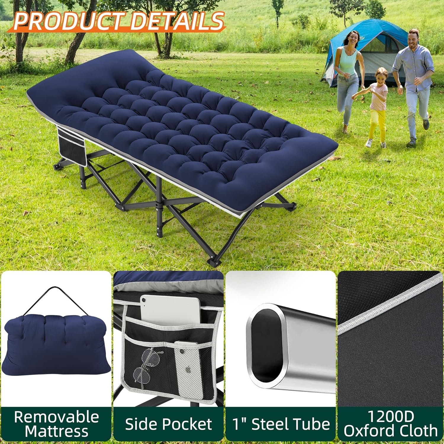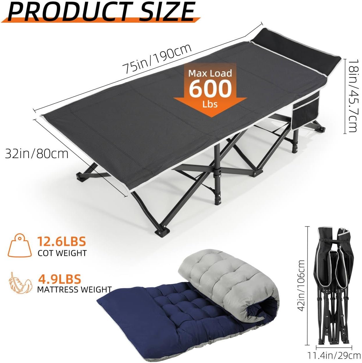 - Sturdy Structure:The heavy duty camping cot is made of 25 mm thick steel tubes and 1200D Oxford fabric surface. The folding camping cot has a loading capacity of 600 LBS, making it as an ideal sleeping cots for everyone. There is an 18° tilt at the head of the sleeping cot for extra comfort when you sleep or relax.