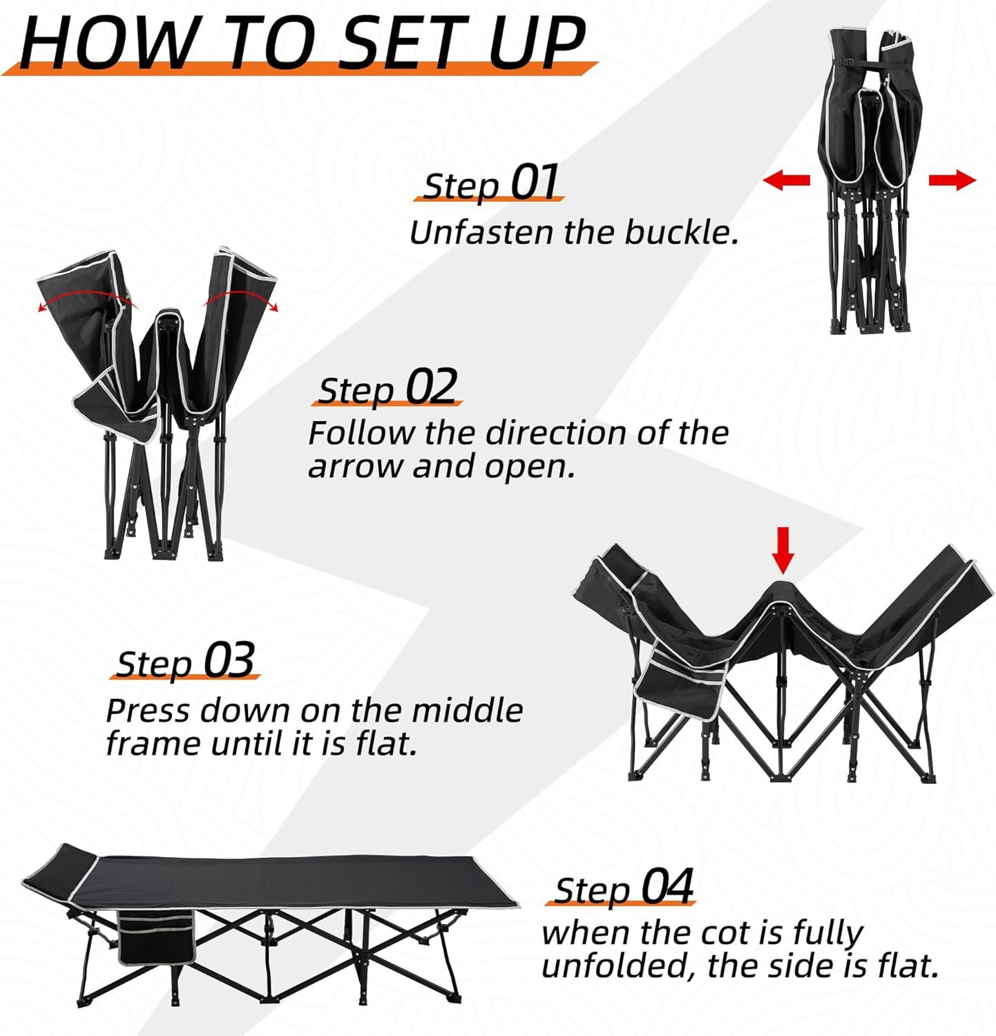 - Easy to Open: Please follow our assemble video on this link. First open the buckle of the folding cot. Secondly, press down on the middle part of the cot until each side of the camping cot is completely flat.